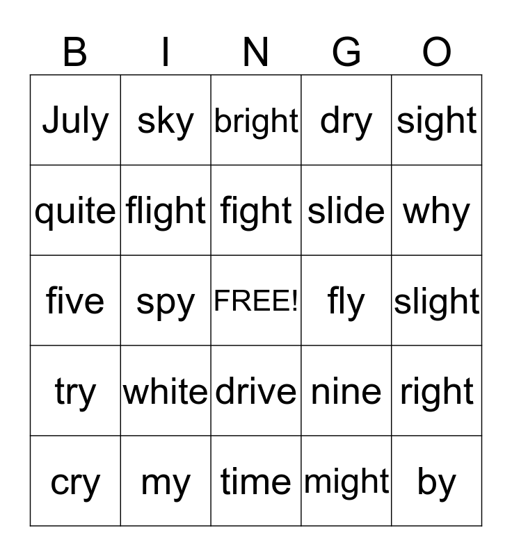 This bingo card has a free space and 30 words: my, like, spy, size, July, bright, flight, drive, fly, time, slight, by, might, while, why, high, nine, try, white, sight, five, light, sky, slide, quite, dry, right, cry, fight and night.