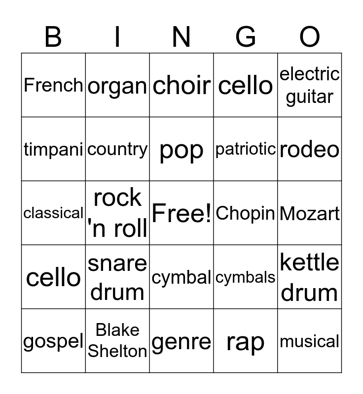 This bingo card has a free space and 24 words: snare drum, Blake Shelton, pop, gospel, electric guitar, French, timpani, organ, Chopin, cymbal, patriotic, classical, cymbals, kettle drum, country, rap, Mozart, choir, rodeo, rock 'n roll, musical, cello, cello and genre.