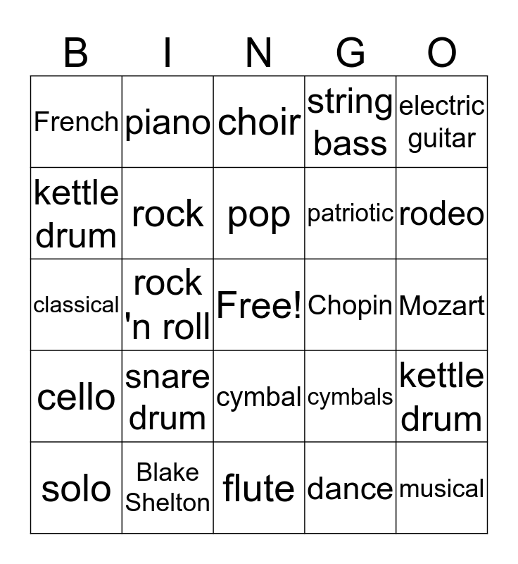 This bingo card has a free space and 24 words: snare drum, Blake Shelton, pop, solo, electric guitar, French, kettle drum, piano, Chopin, cymbal, patriotic, classical, cymbals, kettle drum, rock, dance, Mozart, choir, rodeo, rock 'n roll, musical, cello, string bass and flute.