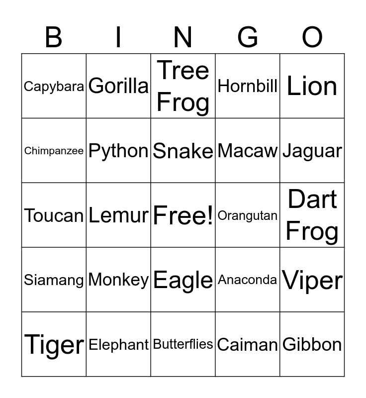 This bingo card has a free space and 24 words: Monkey, Elephant, Snake, Tiger, Lion, Capybara, Chimpanzee, Gorilla, Orangutan, Eagle, Macaw, Toucan, Anaconda, Viper, Python, Caiman, Dart Frog, Tree Frog, Jaguar, Lemur, Gibbon, Siamang, Hornbill and Butterflies.