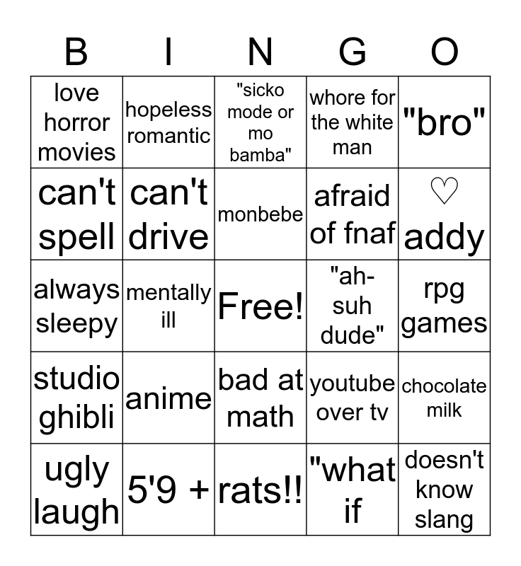 This bingo card has a free space and 24 words: anime, 5'9 +, monbebe, ugly laugh, "bro", love horror movies, can't spell, hopeless romantic, "ah-suh dude", bad at math, afraid of fnaf, always sleepy, youtube over tv, chocolate milk, can't drive, "what if, rpg games, "sicko mode or mo bamba", ♡ addy, mentally ill, doesn't know slang, studio ghibli, whore for the white man and rats!!.