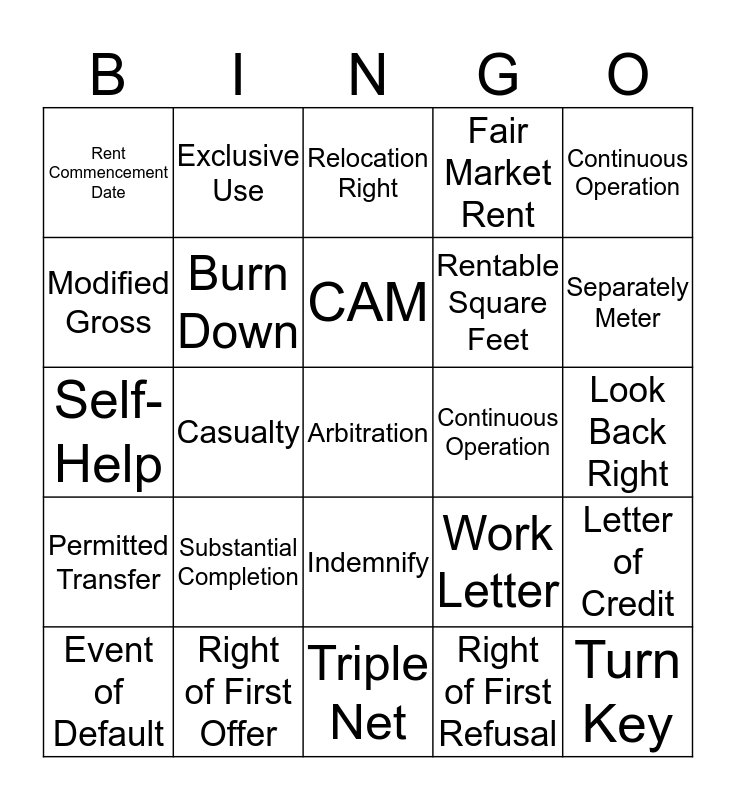 This bingo card has 39 words: Free!, Condemnation, Waiver of Subrogation, Burn Down, Event of Default, Indemnify, CAM, Build-Out, Continuous Operation, Permitted Transfer, Casualty, Fair Market Rent, Arbitration, Look Back Right, Continuous Operation, Substantial Completion, Free Rent, Rent Commencement Date, Specific Performance, Work Letter, Modified Gross, Triple Net, Rentable Square Feet, Separately Meter, Capital Improvement, Allowance, Turn Key, Build-Out, Base Building, Exclusive Use, Base Year, Recapture, Relocation Right, Right of First Offer, Right of First Refusal, Burn Down, Letter of Credit, Self-Help and Percentage Rent.