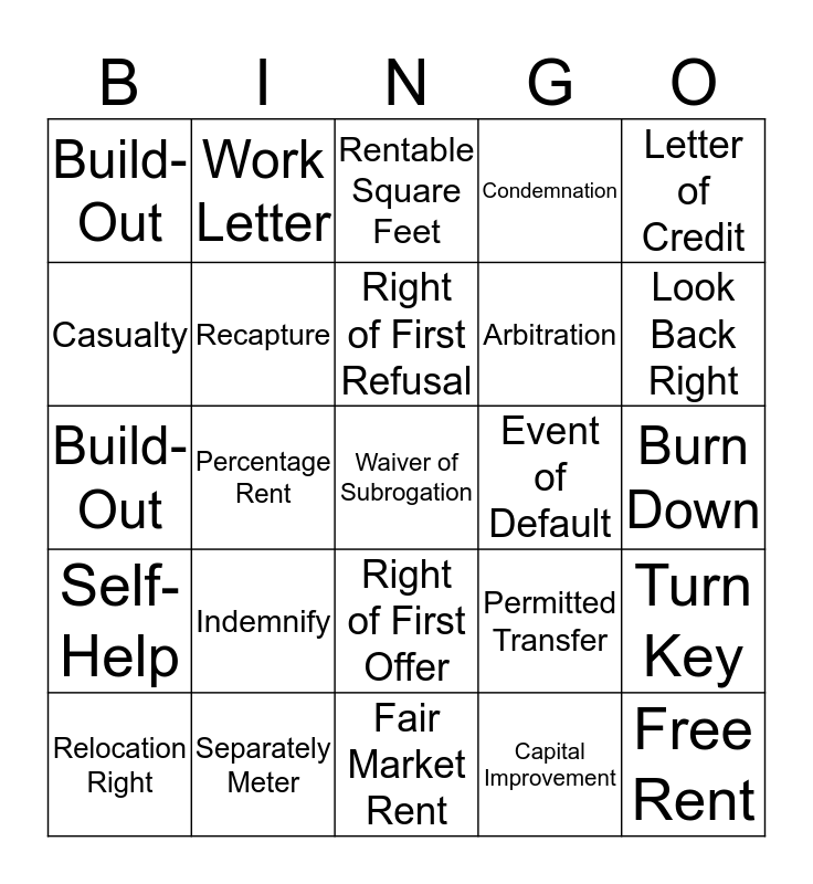 This bingo card has 39 words: Free!, Exclusive Use, Base Year, Recapture, Relocation Right, Right of First Offer, Right of First Refusal, Burn Down, Letter of Credit, Self-Help, Percentage Rent, Condemnation, Waiver of Subrogation, Burn Down, Event of Default, Indemnify, CAM, Build-Out, Continuous Operation, Permitted Transfer, Casualty, Fair Market Rent, Arbitration, Look Back Right, Continuous Operation, Substantial Completion, Free Rent, Rent Commencement Date, Specific Performance, Work Letter, Modified Gross, Triple Net, Rentable Square Feet, Separately Meter, Capital Improvement, Allowance, Turn Key, Build-Out and Base Building.