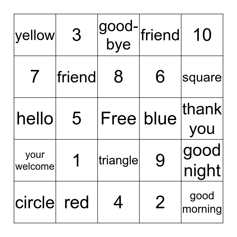 This bingo card has a free space and 24 words: 1, red, 8, circle, 10, yellow, 7, 3, blue, triangle, 6, hello, 9, good night, friend, 2, thank you, good-bye, square, 5, good morning, your welcome, friend and 4.