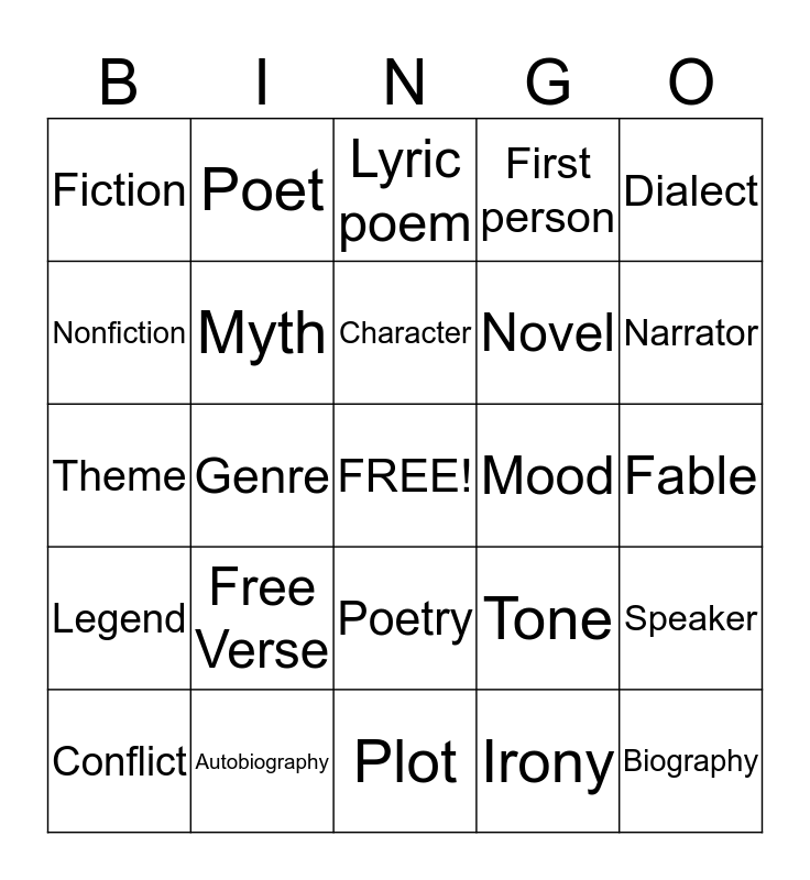 This bingo card has a free space and 24 words: Free Verse, Autobiography, Character, Conflict, Dialect, Fiction, Nonfiction, Poet, Mood, Poetry, Novel, Theme, Tone, Speaker, Myth, Irony, Fable, Lyric poem, Narrator, Genre, Biography, Legend, First person and Plot.