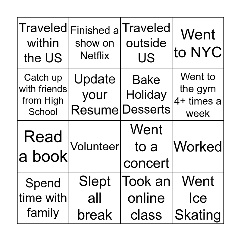 This bingo card has 16 words: Slept all break, Worked, Traveled outside US, Traveled within the US, Read a book, Finished a show on Netflix, Went to a concert, Took an online class, Catch up with friends from High School, Update your Resume, Spend time with family, Went to NYC, Volunteer, Went to the gym 4+ times a week, Bake Holiday Desserts and Went Ice Skating.