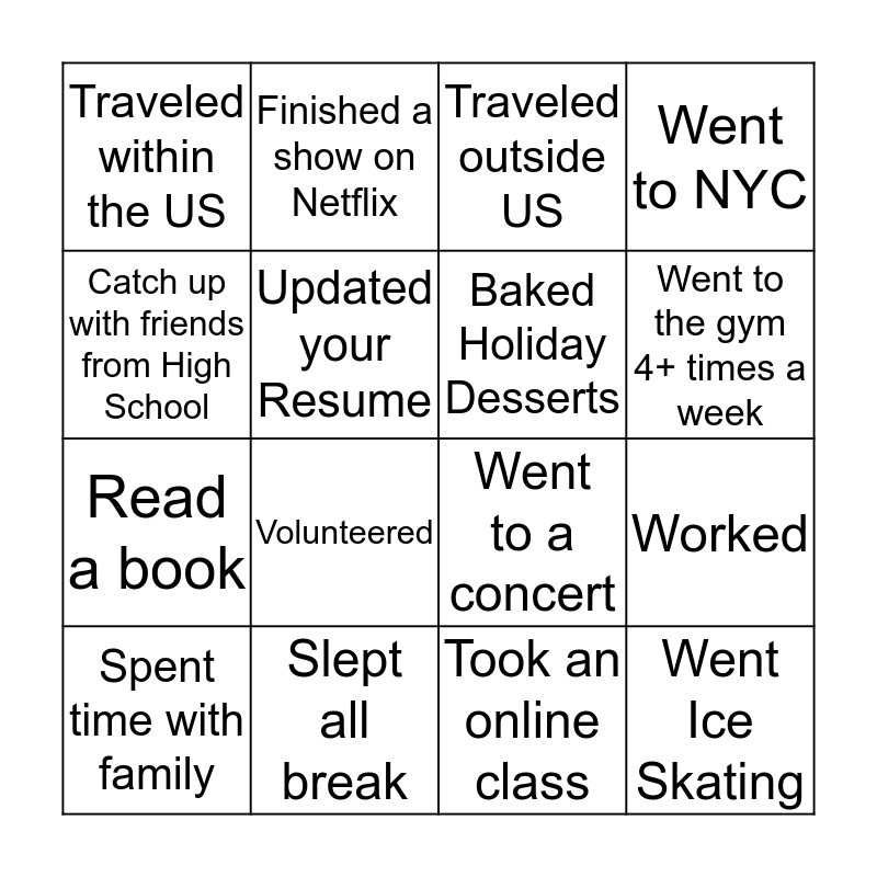 This bingo card has 16 words: Slept all break, Worked, Traveled outside US, Traveled within the US, Read a book, Finished a show on Netflix, Went to a concert, Took an online class, Catch up with friends from High School, Updated your Resume, Spent time with family, Went to NYC, Volunteered, Went to the gym 4+ times a week, Baked Holiday Desserts and Went Ice Skating.