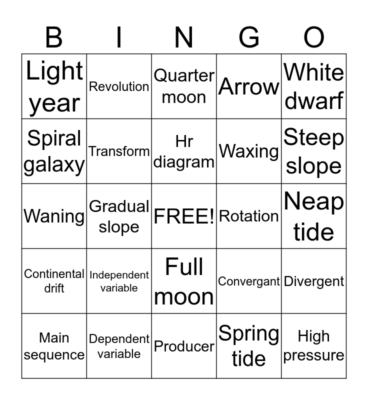 This bingo card has a free space and 24 words: Independent variable, Dependent variable, Hr diagram, Main sequence, White dwarf, Light year, Spiral galaxy, Revolution, Rotation, Full moon, Waxing, Waning, Convergant, Divergent, Transform, Spring tide, Neap tide, Quarter moon, Steep slope, Gradual slope, High pressure, Continental drift, Arrow and Producer.