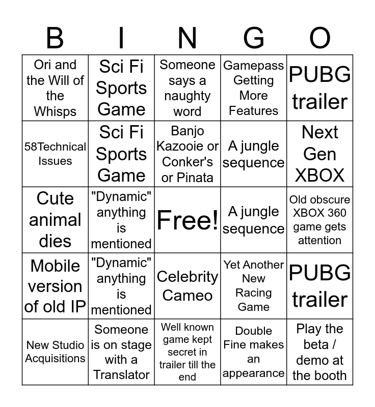 This bingo card has a free space and 3201 words: Technical Issues, Real Gamers, Going off script, Underwhelmed Crowd, Remake or Remaster, Special Edition, Onstage Prop from Game, Celebrity Cameo, Just a title and not much more, Host in the Audience, "Oh and One more Thing", Someone is on stage with a Translator, Someone says a naughty word, Game launched live, Play the beta / demo at the booth, Any level of cosplay, Live Music, Just wait till next E3, release date after June 2020, Suit jacket, graphic shirt, A new battle royale, Mixer is Mentioned, XBox Gamepass Section, ID@Xbox, Hololens, Next Gen XBOX, New Studio Acquisitions, Cloud Gaming, Big stage, stays empty, Gamepass Getting More Features, An awkward handshake, Mobile version of old IP, Brand new game, free with Gamepass, Accessibility Controllers, LOL Kinect, PUBG trailer, Enhanced on XBox, "Dynamic" anything is mentioned, Man on stage yells "Yeah!" when game announced, More POP! Vinyls, Old obscure XBOX 360 game gets attention, Halo Infinite, Forza Horizon 4 expansion, Gears of War 5, Minecraft Earth (Pokemon Go reskin), Cyberpunk 2077, Ori and the Will of the Whisps, Sekiro DLC, Halo MCC on PC release Date, Something Fable Related, Dying Light 2, Sea of Thieves, Battletoads, Banjo Kazooie or Conker's or Pinata, New IP, Age of Empires, Call of Duty: Modern Warfare, Hollow Knight Silk Song, Watch Dogs Legion, We Happy Few DLC, The Outer Worlds, A Helicopter Crashing, At least 2 motorbikes racing each other, 5 or more games in a video slideshow, "EXCLUSIVE" "EXCLUSIVE" "EXCLUSIVE", Black screen, electric guitar, Camera moves from legs up, zoomed in, Narrator is character from the game, Deadpool-eque narration, Seasonal Transitions, No in-game footage, remember: No Gameplay, No Hype, 4D Trailer, 70/80s poppy type song, Well known game kept secret in trailer till the end, Well known landmark used to establish location, Slow motion walking, Cute animal dies, Transition from gameplay to pre-rendered cutscene, #HashtagInGame, A jungle sequence, A thinly veiled reference to modern day politics, The new year of something, A Zombie Game (but they're not called zombies), Hand drawn game, Double Fine makes an appearance, Game about death / disease, Meta Game about the world today, Main character is an animal / hybrid, Just a reskin of a much better game, ANIMOOOOOOOOOOOOO, Card based game, Game set in Ye Oldy Times, Sci Fi Sports Game, FPS Game Shooting Aliens (NOT HALO), Yet Another New Racing Game, Spooky Game, Roguelike Game, Artistic Game, Game set between 1950-1990, A Game where the world is 90% water, Game based off of cartoon, 58Technical Issues, Real Gamers, Going off script, Underwhelmed Crowd, Remake or Remaster, Special Edition, Onstage Prop from Game, Celebrity Cameo, Just a title and not much more, Host in the Audience, "Oh and One more Thing", Someone is on stage with a Translator, Someone says a naughty word, Game launched live, Play the beta / demo at the booth, Any level of cosplay, Live Music, Just wait till next E3, release date after June 2020, Suit jacket, graphic shirt, A new battle royale, Mixer is Mentioned, XBox Gamepass Section, ID@Xbox, Hololens, Next Gen XBOX, New Studio Acquisitions, Cloud Gaming, Big stage, stays empty, Gamepass Getting More Features, An awkward handshake, Mobile version of old IP, Brand new game, free with Gamepass, Accessibility Controllers, LOL Kinect, PUBG trailer, Enhanced on XBox, "Dynamic" anything is mentioned, Man on stage yells "Yeah!" when game announced, More POP! Vinyls, Old obscure XBOX 360 game gets attention, Halo Infinite, Forza Horizon 4 expansion, Gears of War 5, Minecraft Earth (Pokemon Go reskin), Cyberpunk 2077, Ori and the Will of the Whisps, Sekiro DLC, Halo MCC on PC release Date, Something Fable Related, Dying Light 2, Sea of Thieves, Battletoads, Banjo Kazooie or Conker's or Pinata, New IP, Age of Empires, Call of Duty: Modern Warfare, Hollow Knight Silk Song, Watch Dogs Legion, We Happy Few DLC, The Outer Worlds, A Helicopter Crashing, At least 2 motorbikes racing each other, 5 or more games in a video slideshow, "EXCLUSIVE" "EXCLUSIVE" "EXCLUSIVE", Black screen, electric guitar, Camera moves from legs up, zoomed in, Narrator is character from the game, Deadpool-eque narration, Seasonal Transitions, No in-game footage, remember: No Gameplay, No Hype, 4D Trailer, 70/80s poppy type song, Well known game kept secret in trailer till the end, Well known landmark used to establish location, Slow motion walking, Cute animal dies, Transition from gameplay to pre-rendered cutscene, #HashtagInGame, A jungle sequence, A thinly veiled reference to modern day politics, The new year of something, A Zombie Game (but they're not called zombies), Hand drawn game, Double Fine makes an appearance, Game about death / disease, Meta Game about the world today, Main character is an animal / hybrid, Just a reskin of a much better game, ANIMOOOOOOOOOOOOO, Card based game, Game set in Ye Oldy Times, Sci Fi Sports Game, FPS Game Shooting Aliens (NOT HALO), Yet Another New Racing Game, Spooky Game, Roguelike Game, Artistic Game, Game set between 1950-1990, A Game where the world is 90% water, Game based off of cartoon, 58Technical Issues, Real Gamers, Going off script, Underwhelmed Crowd, Remake or Remaster, Special Edition, Onstage Prop from Game, Celebrity Cameo, Just a title and not much more, Host in the Audience, "Oh and One more Thing", Someone is on stage with a Translator, Someone says a naughty word, Game launched live, Play the beta / demo at the booth, Any level of cosplay, Live Music, Just wait till next E3, release date after June 2020, Suit jacket, graphic shirt, A new battle royale, Mixer is Mentioned, XBox Gamepass Section, ID@Xbox, Hololens, Next Gen XBOX, New Studio Acquisitions, Cloud Gaming, Big stage, stays empty, Gamepass Getting More Features, An awkward handshake, Mobile version of old IP, Brand new game, free with Gamepass, Accessibility Controllers, LOL Kinect, PUBG t