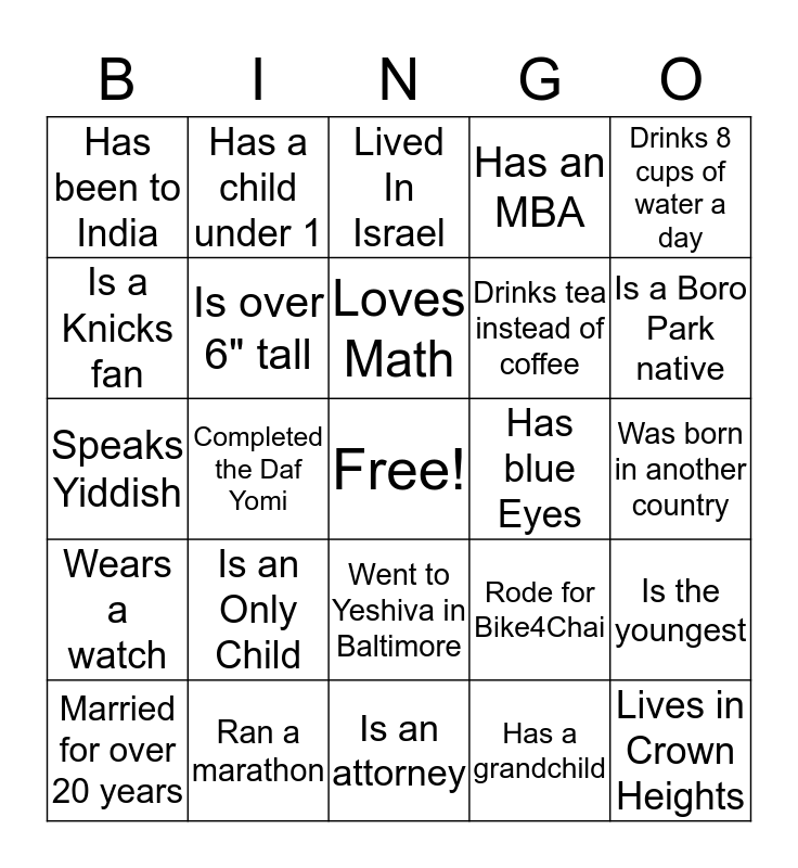 This bingo card has a free space and 24 words: Is an Only Child, Ran a marathon, Loves Math, Married for over 20 years, Drinks 8 cups of water a day, Has been to India, Is a Knicks fan, Has a child under 1, Has blue Eyes, Went to Yeshiva in Baltimore, Drinks tea instead of coffee, Speaks Yiddish, Rode for Bike4Chai, Is the youngest, Is over 6" tall, Has a grandchild, Was born in another country, Lived In Israel, Is a Boro Park native, Completed the Daf Yomi, Lives in Crown Heights, Wears a watch, Has an MBA and Is an attorney.