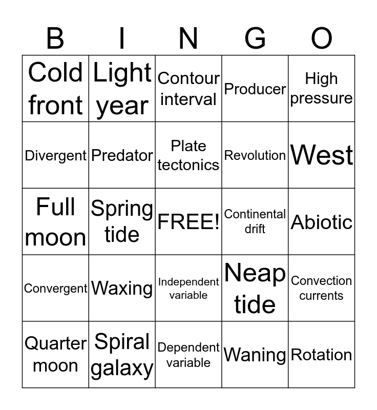 This bingo card has a free space and 24 words: Waxing, Spiral galaxy, Plate tectonics, Quarter moon, High pressure, Cold front, Divergent, Light year, Continental drift, Independent variable, Revolution, Full moon, Neap tide, Convection currents, Predator, Waning, Abiotic, Contour interval, West, Spring tide, Rotation, Convergent, Producer and Dependent variable.