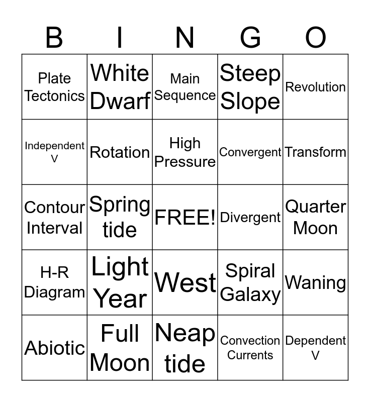 This bingo card has a free space and 24 words: Light Year, Full Moon, High Pressure, Abiotic, Revolution, Plate Tectonics, Independent V, White Dwarf, Divergent, West, Convergent, Contour Interval, Spiral Galaxy, Waning, Rotation, Convection Currents, Quarter Moon, Main Sequence, Transform, Spring tide, Dependent V, H-R Diagram, Steep Slope and Neap tide.