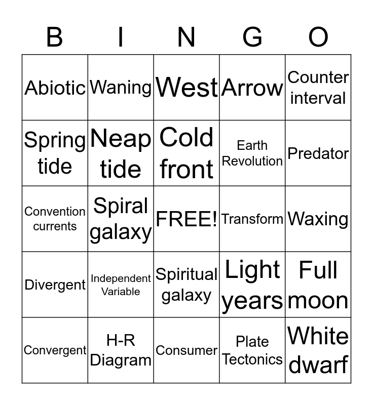 This bingo card has a free space and 24 words: Independent Variable, H-R Diagram, Cold front, Convergent, Counter interval, Abiotic, Spring tide, Waning, Transform, Spiritual galaxy, Earth Revolution, Convention currents, Light years, Full moon, Neap tide, Plate Tectonics, Waxing, West, Predator, Spiral galaxy, White dwarf, Divergent, Arrow and Consumer.
