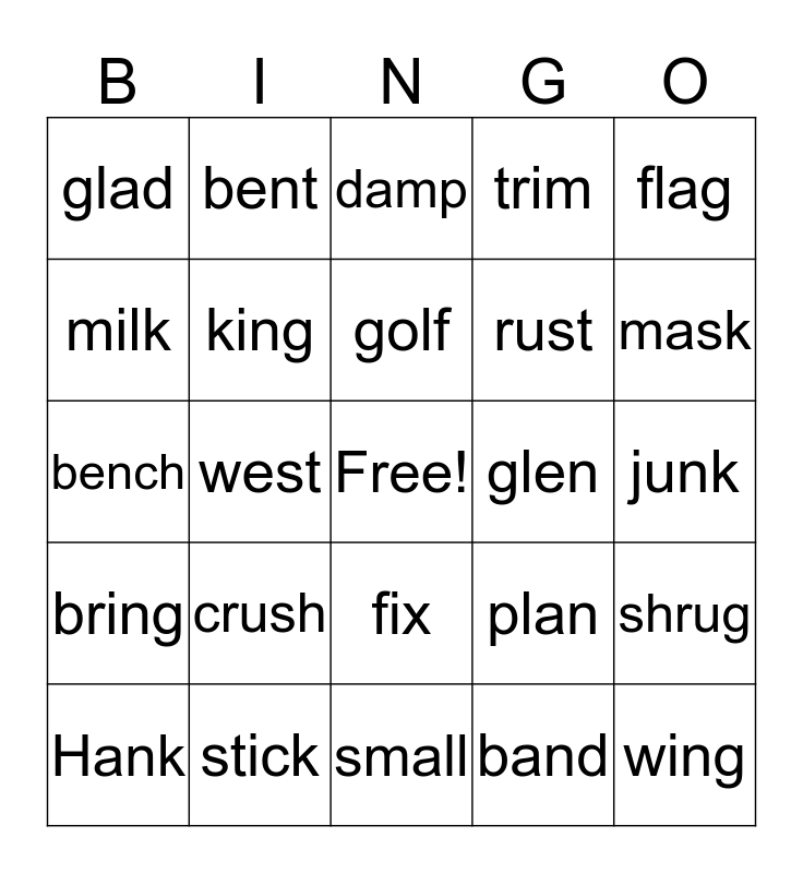 This bingo card has a free space and 29 words: Hank, cluck, west, blush, glad, damp, king, crush, glen, stick, junk, wing, small, band, mask, snap, fix, bring, flag, bench, plan, clang, rust, milk, trim, bent, shrug, golf and twig.