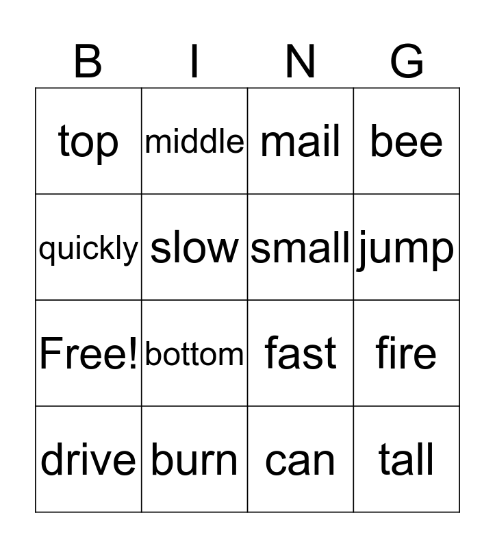 This bingo card has 20 words: fire, doctor, mail, letter, drive, quickly, burn, top, Free!, middle, bottom, fast, slow, tall, small, strong, jump, bee, can and run.