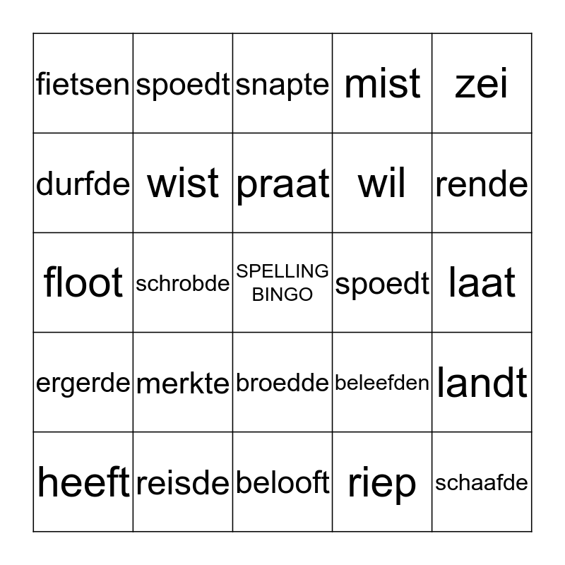 This bingo card has a free space and 24 words: merkte, reisde, praat, heeft, zei, fietsen, durfde, spoedt, spoedt, broedde, wil, floot, beleefden, landt, wist, riep, laat, snapte, rende, schrobde, schaafde, ergerde, mist and belooft.
