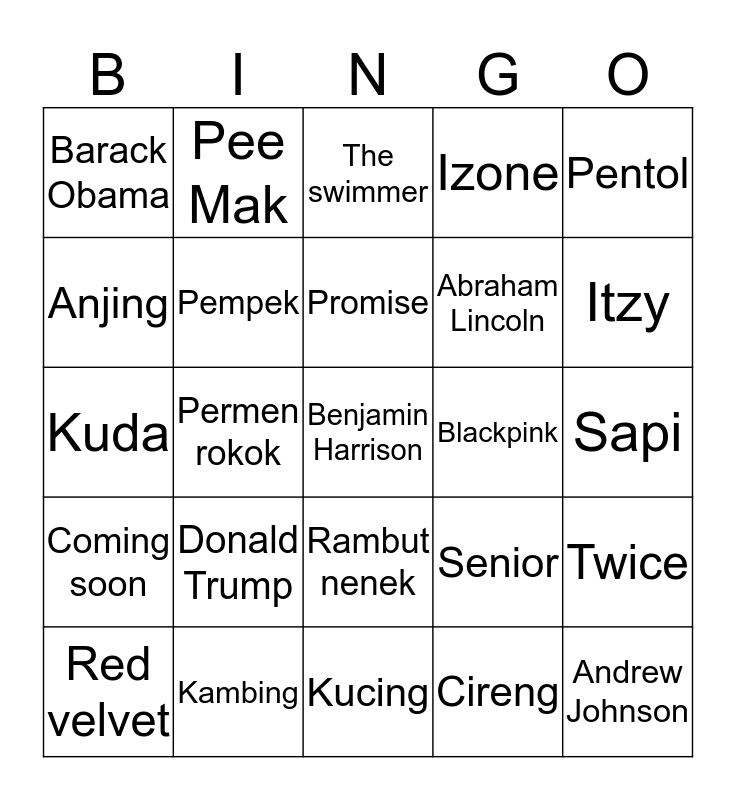 This bingo card has 25 words: Donald Trump, Kucing, Promise, Red velvet, Pentol, Barack Obama, Anjing, Pee Mak, Blackpink, Rambut nenek, Abraham Lincoln, Kuda, Senior, Twice, Pempek, Andrew Johnson, Sapi, The swimmer, Itzy, Permen rokok, Benjamin Harrison, Kambing, Coming soon, Izone and Cireng.