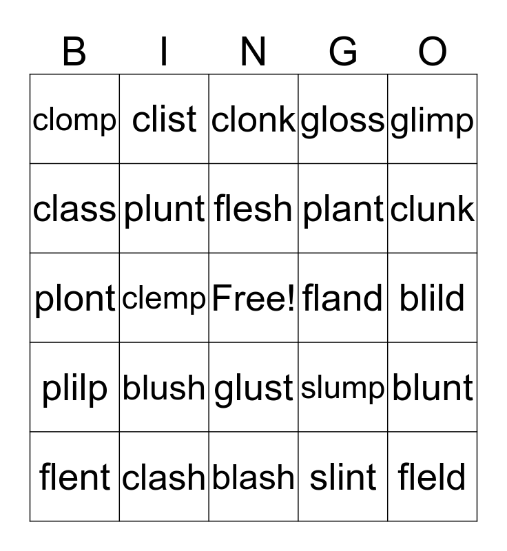 This bingo card has a free space and 24 words: blush, clash, flesh, flent, glimp, clomp, class, clist, fland, glust, plant, plont, slump, blunt, plunt, slint, blild, clonk, clunk, clemp, fleld, plilp, gloss and blash.
