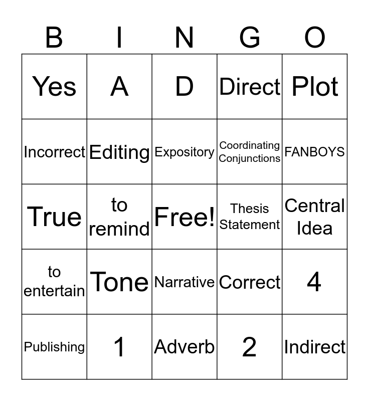 This bingo card has a free space and 39 words: Prewriting, Drafting, Revising, Editing, Publishing, Narrative, Expository, Setting, Plot, to entertain, to remind, Direct, Indirect, Central Idea, Thesis Statement, Tone, Double Negative, Yes, No, Correct, Incorrect, Adverb, Coordinating Conjunctions, FANBOYS, Comma, Hamburger Style, Topic Sentence, Detail Sentence, Conclusion Sentence, A, B, C, D, 1, 2, 3, 4, True and False.