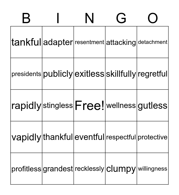This bingo card has a free space and 29 words: profitless, bananas, stingless, timidness, tankful, resentment, publicly, thankful, wellness, grandest, gutless, willingness, recklessly, clumpy, regretful, fulfillment, eventful, vapidly, detachment, rapidly, respectful, wishful, skillfully, presidents, attacking, adapter, protective, exitless and intently.