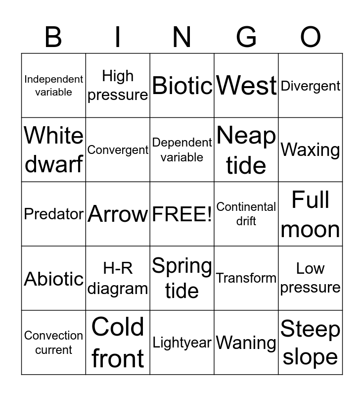 This bingo card has a free space and 24 words: H-R diagram, Cold front, Dependent variable, Convection current, Divergent, Independent variable, White dwarf, High pressure, Continental drift, Spring tide, Neap tide, Predator, Transform, Low pressure, Convergent, Waning, Full moon, Biotic, Waxing, Arrow, Steep slope, Abiotic, West and Lightyear.