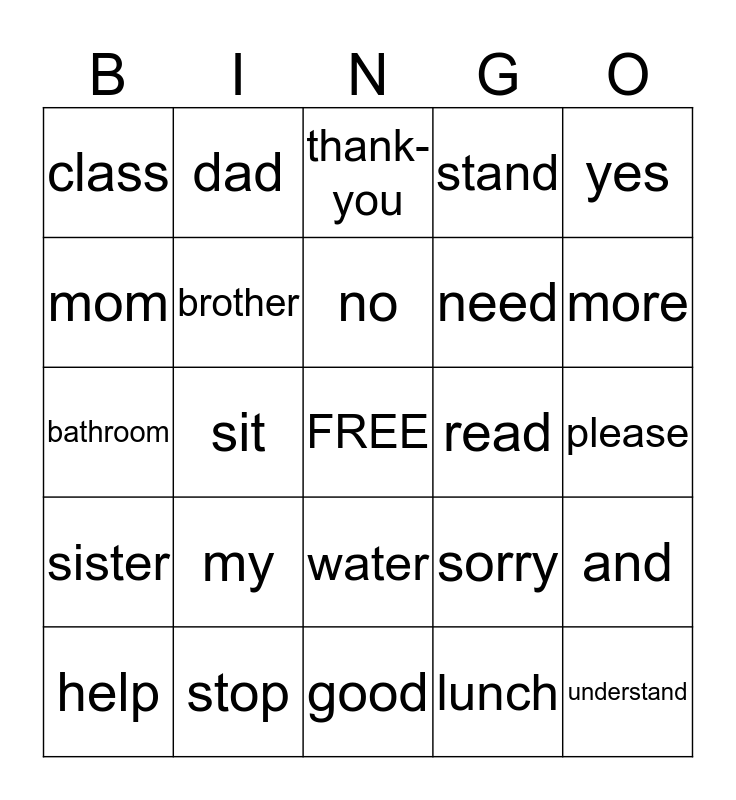 This bingo card has a free space and 24 words: my, stop, no, help, yes, class, mom, dad, read, water, need, bathroom, sorry, and, brother, lunch, please, thank-you, more, sit, understand, sister, stand and good.