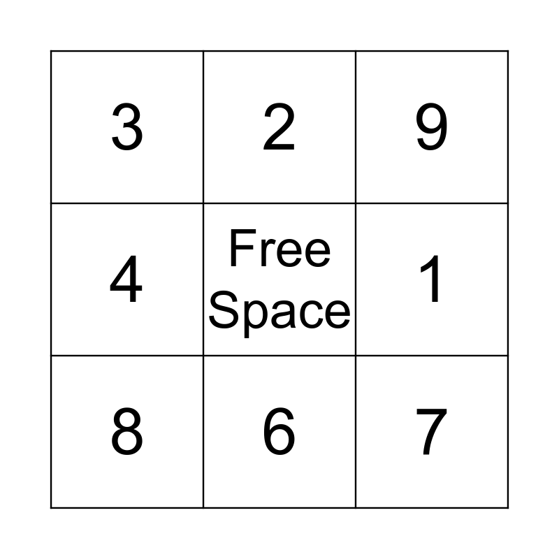 This bingo card has a free space and 8 words: 1, 9, 2, 8, 3, 7, 4 and 6.