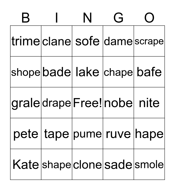 This bingo card has a free space and 24 words: tape, shape, lake, Kate, scrape, trime, shope, clane, nobe, pume, chape, grale, ruve, hape, bade, sade, nite, sofe, bafe, drape, smole, pete, dame and clone.