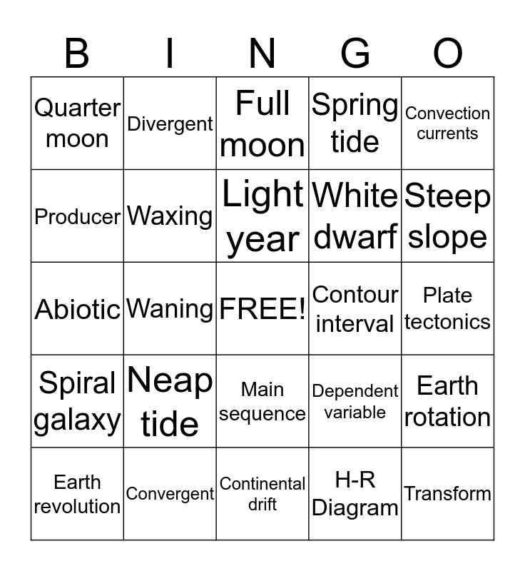 This bingo card has a free space and 24 words: Neap tide, Convergent, Light year, Earth revolution, Convection currents, Quarter moon, Producer, Divergent, Contour interval, Main sequence, White dwarf, Abiotic, Dependent variable, Earth rotation, Waxing, H-R Diagram, Plate tectonics, Full moon, Steep slope, Waning, Transform, Spiral galaxy, Spring tide and Continental drift.