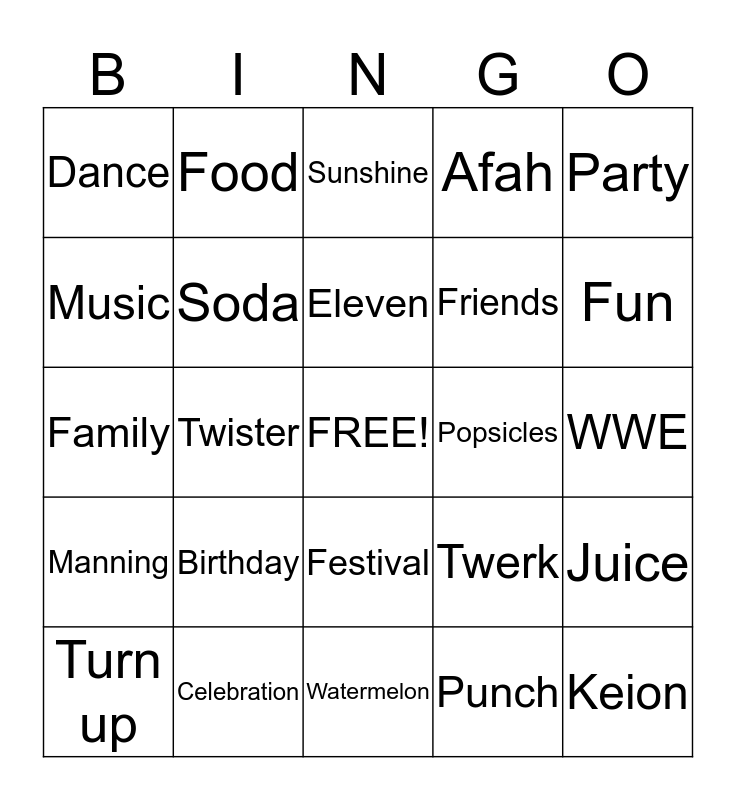 This bingo card has a free space and 24 words: Birthday, Celebration, Eleven, Turn up, Party, Dance, Music, Food, Popsicles, Festival, Friends, Family, Twerk, Juice, Soda, Punch, WWE, Sunshine, Fun, Twister, Keion, Manning, Afah and Watermelon.
