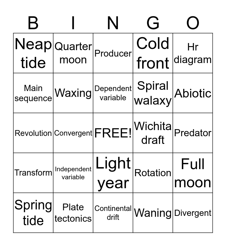 This bingo card has a free space and 24 words: Independent variable, Plate tectonics, Dependent variable, Spring tide, Hr diagram, Neap tide, Main sequence, Quarter moon, Wichita draft, Light year, Spiral walaxy, Revolution, Rotation, Full moon, Waxing, Waning, Predator, Producer, Abiotic, Convergent, Divergent, Transform, Cold front and Continental drift.