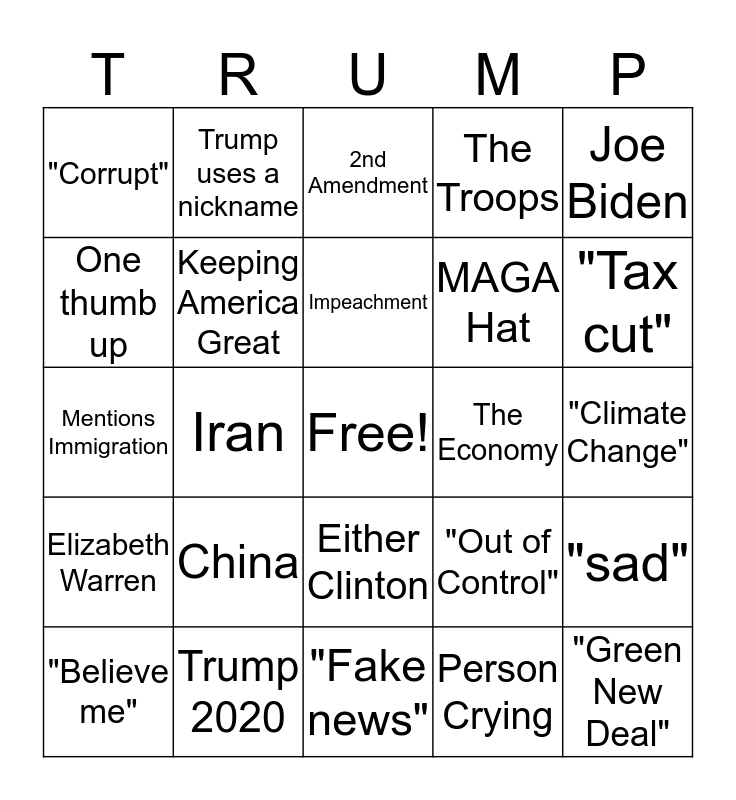 This bingo card has a free space and 40 words: Mentions Health Care, Mentions Immigration, Mentions Education, Keeping America Great, Trump 2020, Either Clinton, Impeachment, Iowa Caucus, Joe Biden, Elizabeth Warren, Iran, The Troops, "Green New Deal", "Climate Change", The Economy, China, "Melania", "Corrupt", "Radical", 2nd Amendment, "sad", Person Crying, MAGA Hat, One thumb up, Two thumbs up, China, Talks about self in third person, Winks, Someone picks their nose, Sips water, Nancy Pelosi, "Believe me", GOP, "Out of Control", "Tax cut", "Fake news", Space Force, Democrats Boo, Trump uses a nickname and Nuclear Weapons.