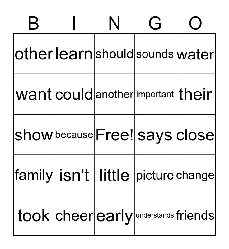 This bingo card has a free space and 35 words: both, even, there, could, little, sounds, want, were, another, move, show, water, year, number, other, says, understands, because, family, friends, picture, took, change, cheer, should, their, won, thought, important, close, straight, early, isn't, learn and these.