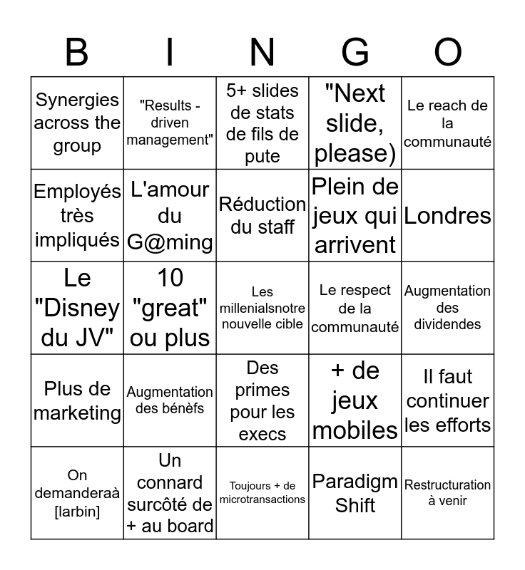 This bingo card has a free space and 24 words: Augmentation des bénèfs, Un connard surcôté de + au board, Réduction du staff, On demanderaà [larbin], Le reach de la communauté, Synergies across the group, Employés très impliqués, "Results -driven management", Le respect de la communauté, Des primes pour les execs, Plein de jeux qui arrivent, Le "Disney du JV", + de jeux mobiles, Il faut continuer les efforts, L'amour du G@ming, Paradigm Shift, Augmentation des dividendes, 5+ slides de stats de fils de pute, Londres, 10 "great" ou plus, Restructuration à venir, Plus de marketing, "Next slide, please) and Toujours + de microtransactions.