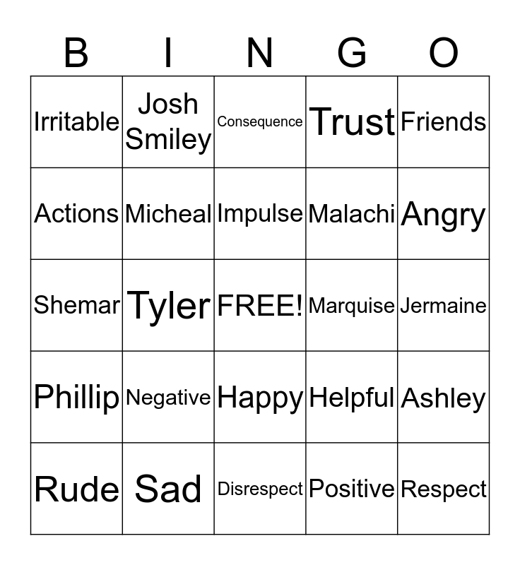 This bingo card has a free space and 24 words: Negative, Sad, Impulse, Rude, Friends, Irritable, Actions, Josh Smiley, Marquise, Happy, Malachi, Shemar, Helpful, Ashley, Micheal, Positive, Jermaine, Consequence, Angry, Tyler, Respect, Phillip, Trust and Disrespect.