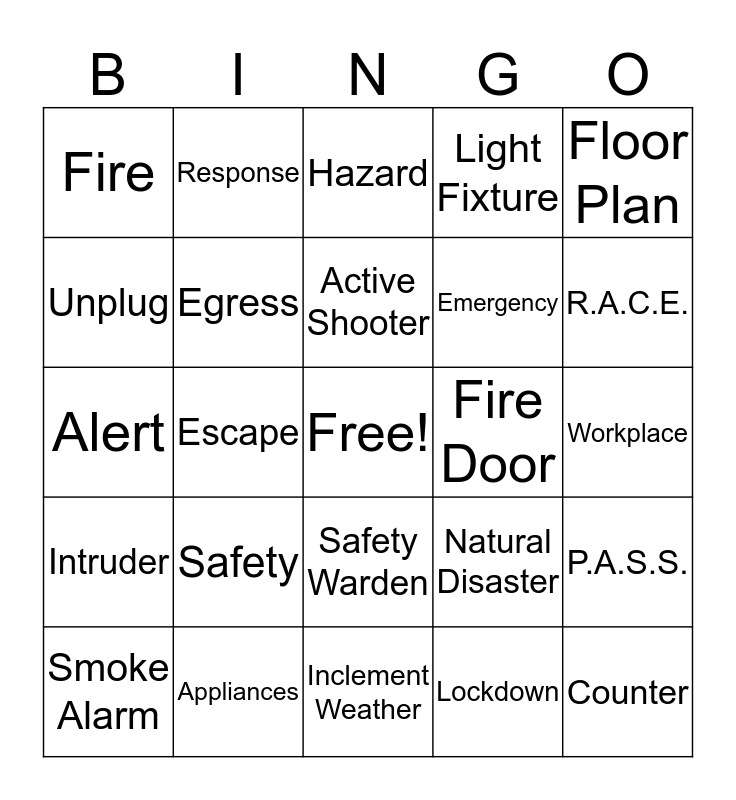 This bingo card has a free space and 24 words: Safety, Appliances, Active Shooter, Smoke Alarm, Floor Plan, Fire, Unplug, Response, Fire Door, Safety Warden, Emergency, Alert, Natural Disaster, P.A.S.S., Egress, Lockdown, Workplace, Hazard, R.A.C.E., Escape, Counter, Intruder, Light Fixture and Inclement Weather.