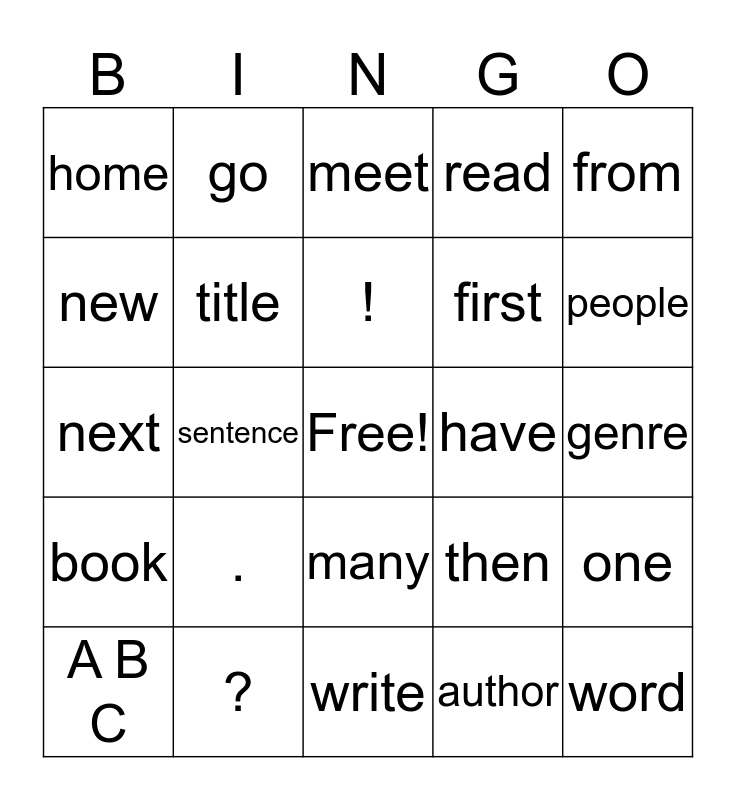 This bingo card has a free space and 24 words: ., ?, !, A B C, from, home, new, go, have, many, first, next, then, one, title, author, genre, meet, people, sentence, word, book, read and write.