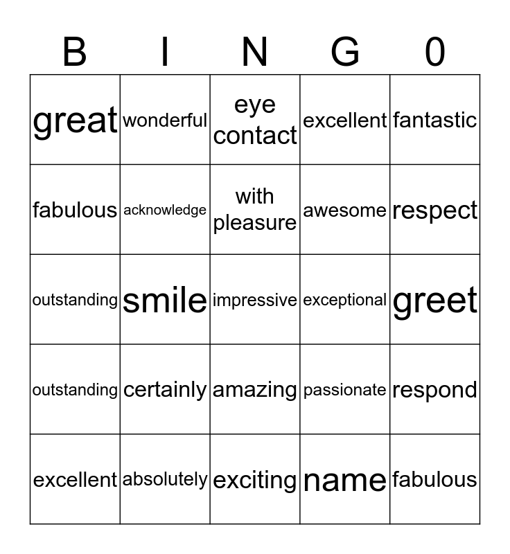This bingo card has a free space and 24 words: certainly, absolutely, with pleasure, excellent, fantastic, great, fabulous, wonderful, exceptional, amazing, awesome, outstanding, passionate, respond, acknowledge, name, greet, eye contact, respect, smile, fabulous, outstanding, excellent and exciting.