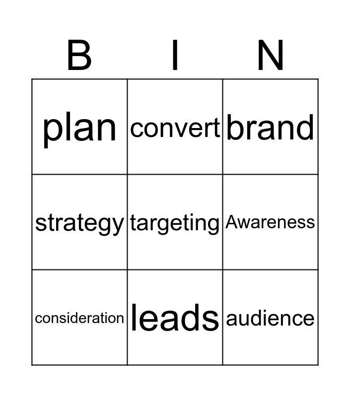 This bingo card has a free space and 8 words: Awareness, brand, convert, consideration, plan, audience, strategy and leads.