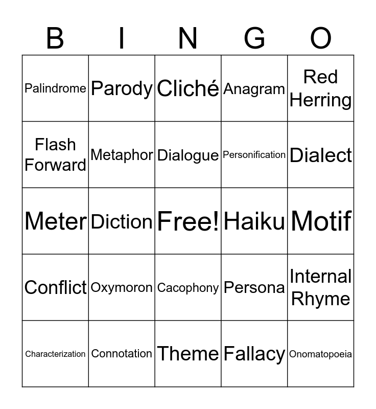 This bingo card has a free space and 116 words: Adage, Allegory, Alliteration, Allusion, Ambiguity, Anachronism, Anagram, Analogy, Anecdote, Antagonist, Antecedent, Antithesis, Apostrophe, Archetype, Argument, Biography, Cacophony, Cadence, Caricature, Catharsis, Characterization, Cliché, Climax, Colloquialism, Comparison, Conflict, Connotation, Consonance, Denotation, Deus Ex Machina, Dialect, Dialogue, Diction, Discourse, Doppelganger, Double Entendre, Ellipsis, Epiphany, Epitaph, Essay, Ethos, Eulogy, Euphemism, Evidence, Exposition, Fable, Fallacy, Flash Forward, Foil, Foreshadowing, Genre, Haiku, Half Rhyme, Hubris, Hyperbole, Idiom, Imagery, Induction, Inference, Innuendo, Internal Rhyme, Irony, Jargon, Juxtaposition, Limerick, Line Break, Memoir, Metaphor, Meter, Mood, Motif, Narrative, Nemesis, Non Sequitur, Ode, Onomatopoeia, Oxymoron, Palindrome, Parable, Paradox, Parallelism, Parody, Pentameter, Persona, Personification, Plot, Poem, Poetic Justice, Point of View, Portmanteau, Propaganda, Prose, Protagonist, Pun, Red Herring, Repetition, Rhetoric, Rhyme, Rhythm, Sarcasm, Satire, Simile, Soliloquy, Sonnet, Style, Superlative, Symbolism, Syntax, Theme, Thesis, Tone, Tragedy, Tragic Flaw, Transition, Utopia and Verisimilitude.