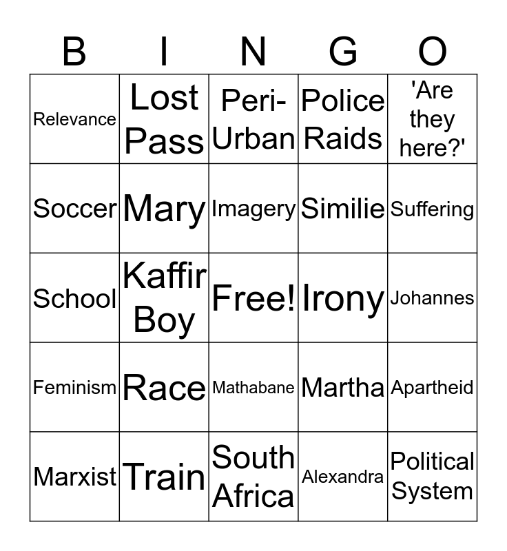 This bingo card has a free space and 28 words: Apartheid, Tennis, Similie, Alexandra, Soccer, Peri-Urban, Lost Pass, Feminism, Irony, Marxist, School, Police Raids, Train, South Africa, Suffering, America, Race, Mary, Imagery, Mathabane, Relevance, Mandela, Political System, Kaffir Boy, Johannes, Martha, 'Are they here?' and U. of South Carolina.