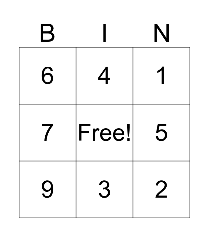 This bingo card has a free space and 8 words: 5, 1, 4, 9, 6, 2, 7 and 3.