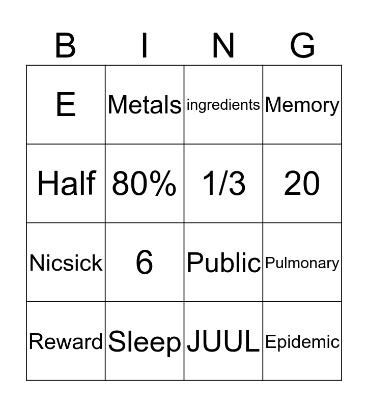 This bingo card has 25 words: One, 1,299, 20, Blood, Half, E, 80%, Metals, Sleep, Massachusetts, Nicsick, Public, Infections, 21, 1/3, Vending, JUUL, ingredients, 6, Pulmonary, Reward, Shaking, Epidemic, Memory and Vomiting.