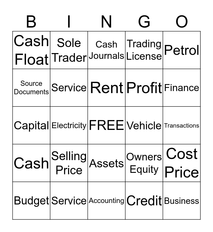 This bingo card has a free space and 37 words: Drawings, Income, Expense, Service, Cost Price, Selling Price, Rent, Telephone, Petrol, Repairs, Electricity, Trading License, Business, Transactions, Source Documents, Cash, Cheque, Cash Journals, Assets, Vehicle, Cash Float, Finance, Budget, Accounting, Debit, Credit, Sole Trader, Partnership, Company, Manufacturing, Trading, Service, Capital, Loan, Owners Equity, Profit and Loss.