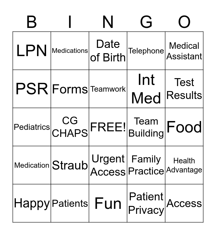 This bingo card has a free space and 24 words: Straub, Patients, Teamwork, Happy, Medical Assistant, LPN, PSR, Medications, Team Building, Urgent Access, Int Med, Pediatrics, Family Practice, Health Advantage, Forms, Patient Privacy, Food, Date of Birth, Test Results, CG CHAPS, Access, Medication, Telephone and Fun.
