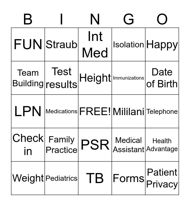 This bingo card has a free space and 24 words: Family Practice, Pediatrics, Height, Weight, Happy, FUN, Team Building, Straub, Mililani, PSR, Immunizations, LPN, Medical Assistant, Health Advantage, Test results, Forms, Telephone, Int Med, Date of Birth, Medications, Patient Privacy, Check in, Isolation and TB.