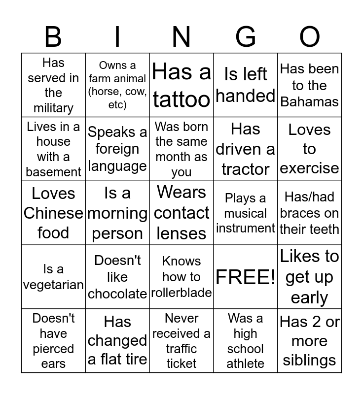 This bingo card has 25 words: Doesn't like chocolate, Never received a traffic ticket, Was born the same month as you, Doesn't have pierced ears, Has been to the Bahamas, Has served in the military, Lives in a house with a basement, Owns a farm animal (horse, cow, etc), Plays a musical instrument, Knows how to rollerblade, Has driven a tractor, Loves Chinese food, FREE!, Likes to get up early, Speaks a foreign language, Has 2 or more siblings, Has/had braces on their teeth, Has a tattoo, Loves to exercise, Is a morning person, Wears contact lenses, Has changed a flat tire, Is a vegetarian, Is left handed and Was a high school athlete.
