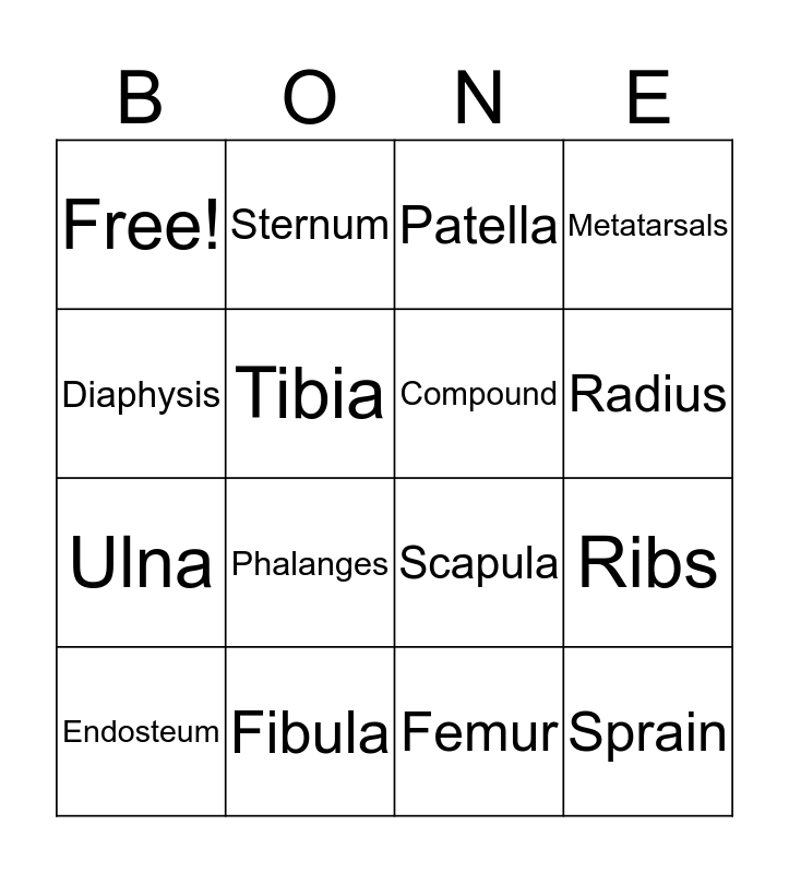 This bingo card has 16 words: Endosteum, Fibula, Patella, Metatarsals, Diaphysis, Sternum, Scapula, Ribs, Free!, Tibia, Femur, Radius, Ulna, Phalanges, Compound and Sprain.