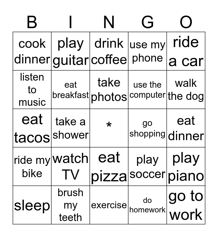 This bingo card has a free space and 29 words: sleep, wake up, take a shower, go to school, cook dinner, drink coffee, eat breakfast, watch TV, go shopping, brush my teeth, eat dinner, go to work, exercise, do homework, walk the dog, go to bed, eat pizza, ride my bike, ride a car, eat tacos, play soccer, ride a motorcycle, use the computer, listen to music, use my phone, play guitar, play piano, take photos and draw a picture.