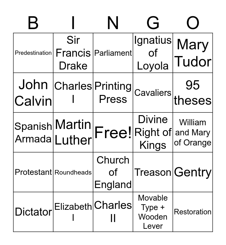 This bingo card has a free space and 30 words: Elizabeth I, James II, Martin Luther, Gutenburg, Predestination, Parliament, Charles I, Church of England, Divine Right of Kings, Charles II, William and Mary of Orange, Restoration, Movable Type + Wooden Lever, Council of Trent, 95 theses, Glorious Revolution, Treason, Protestant, Roundheads, Mary Tudor, Spanish Armada, Galileo, Sir Francis Drake, Cavaliers, John Calvin, Ignatius of Loyola, Gentry, Dictator, Printing Press and Phillip II of Spain.